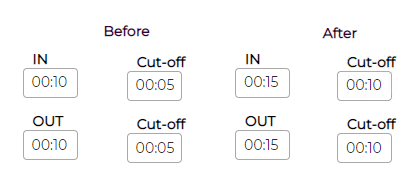 The rules defined below before will be applied if an employee swiped IN/OUT before scheduled time. The rules defined below after will be applied if an employee swiped IN/OUT after scheduled time.