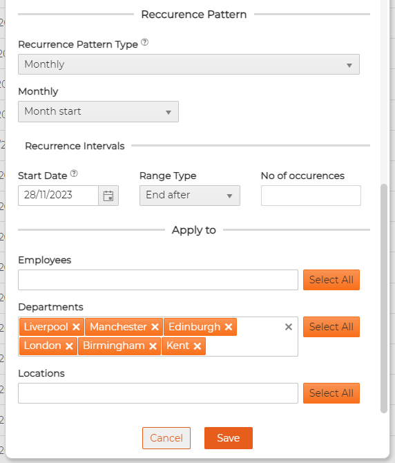 Recurrence Intervals | Rule pattern intervals [ Weekly, Monthly, Quarterly, Yearly ] |
